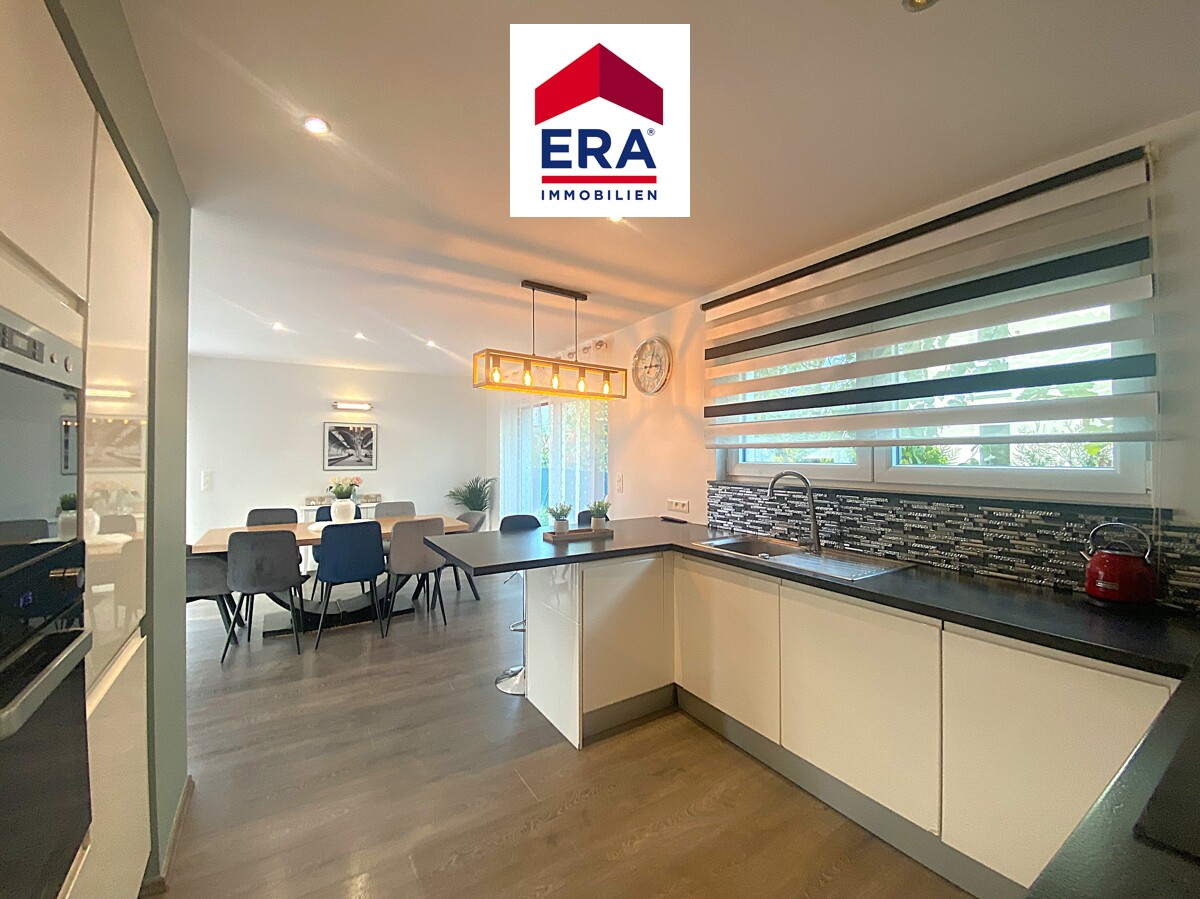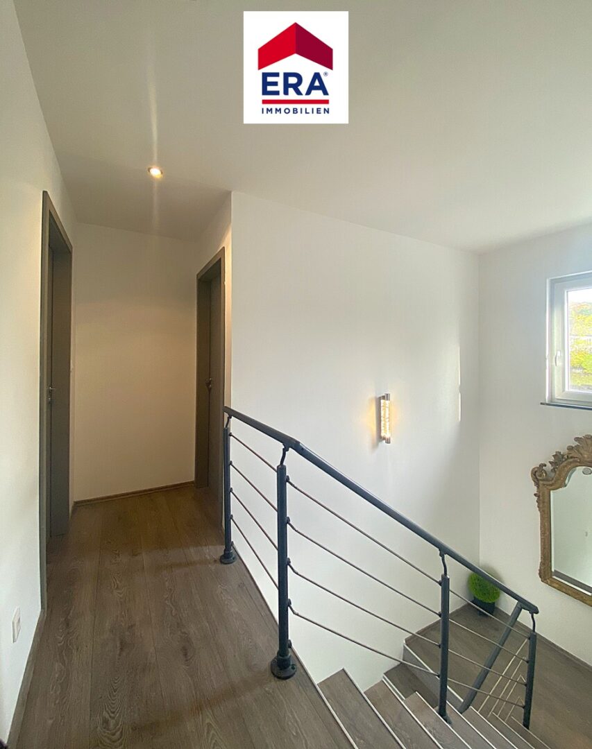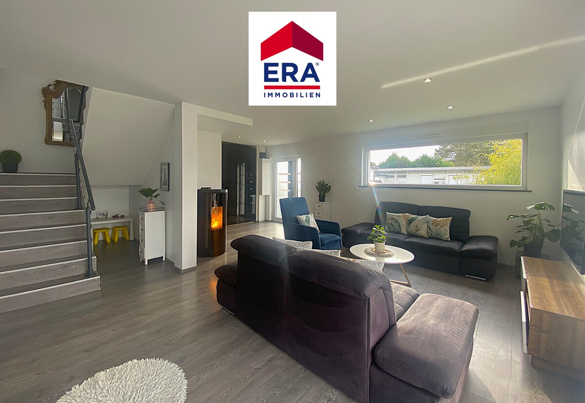 Im EG befinden sich der Wohn-, Essbereich mit Pelletofen und direktem Zugang zur Terrasse mit Garten, die offene Küche mit Sitztheke, ein separates WC mit Waschbecken sowie der Zugang zur Waschküche und Garage für einen PKW.